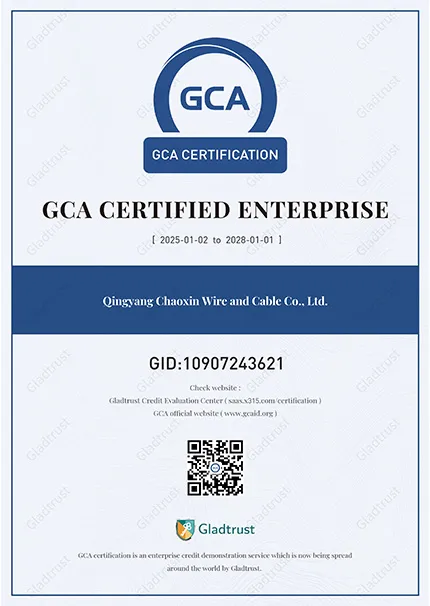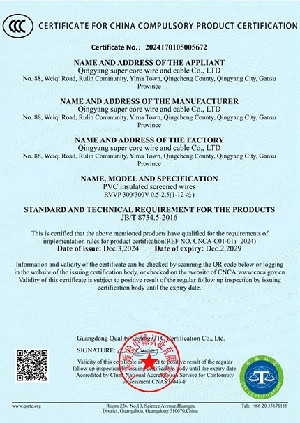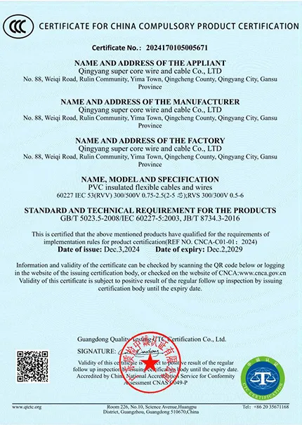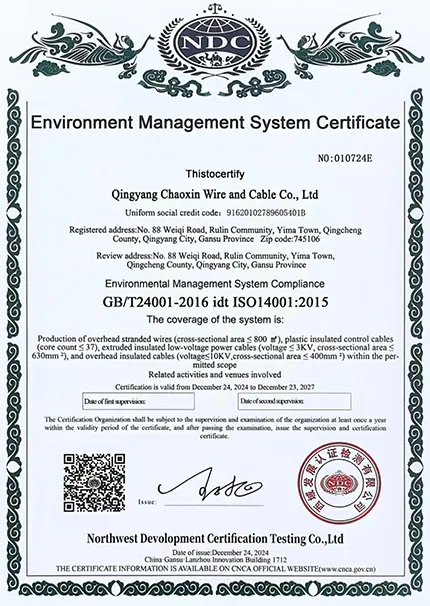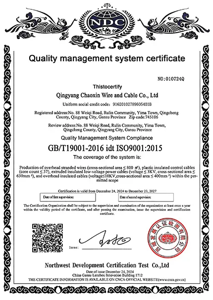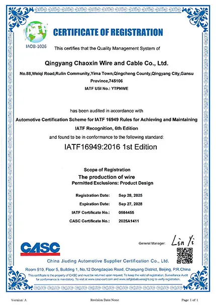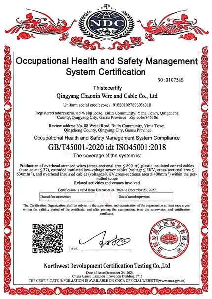 Компания «Чаосинь Кабель» последовательно получила «Национальную лицензию на производство промышленных товаров», «Сертификат кредитного рейтинга предприятия уровня AAA», «Сертификат обязательной сертификации продукции Китая», «Сертификат безопасности продукции для горнодобывающей промышленности», «Сертификат IATF 16949», «Сертификат системы управления качеством», «Сертификат системы экологического менеджмента» и «Сертификат системы управления охраной труда и промышленной безопасностью».